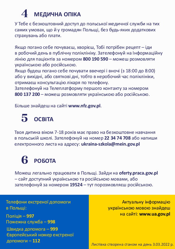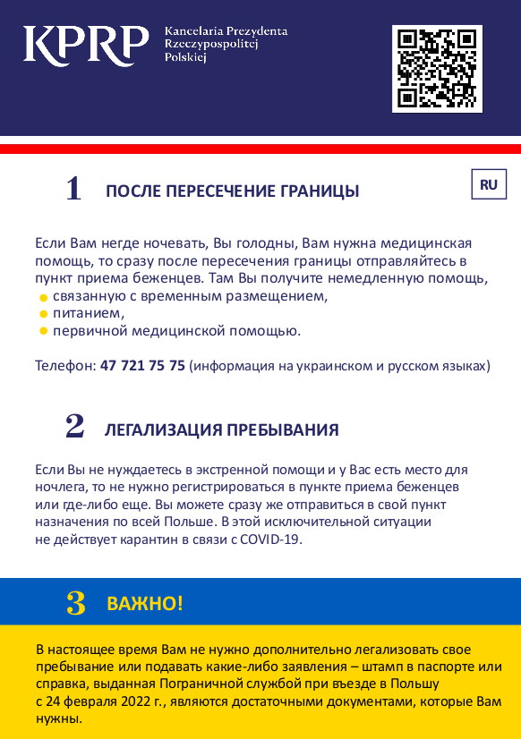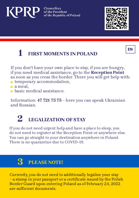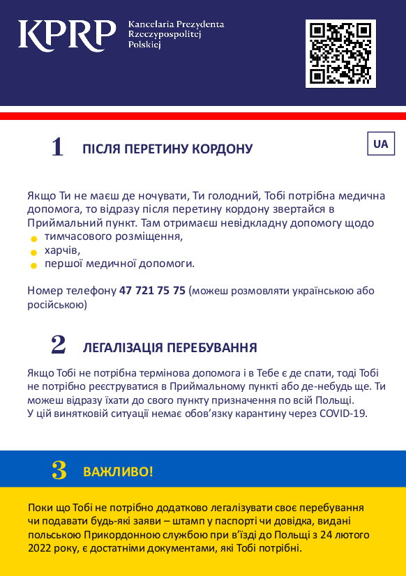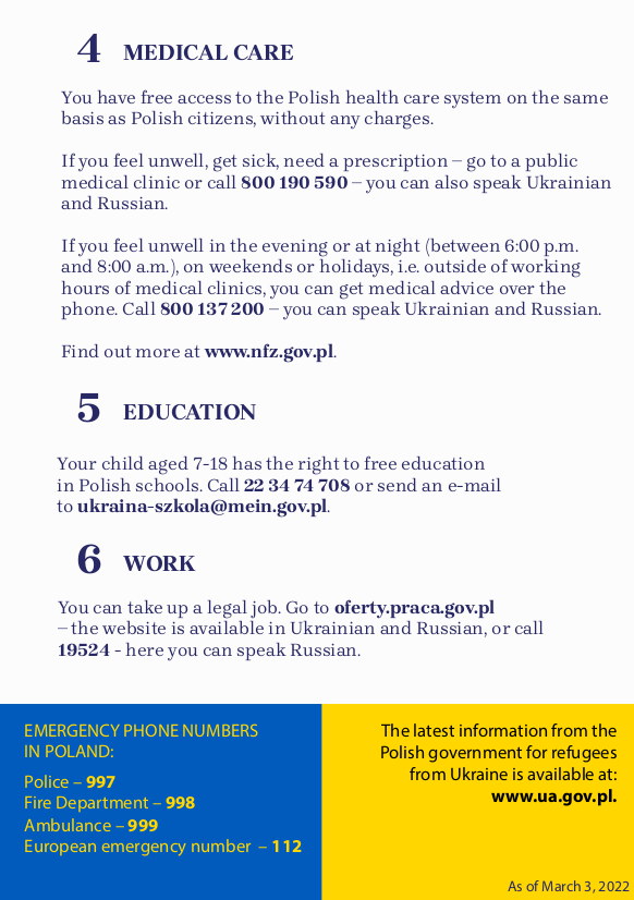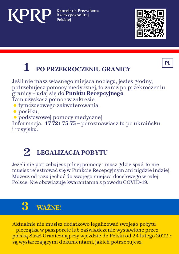 Zachęcamy do zapoznania się z informacjami dla uchodźców z Ukrainy dotyczącymi pierwszych kroków, które należy podjąć po przekroczeniu polskiej granicy. Informacje przygotowano w języku polskim, ukraińskim, angielskim i rosyjskim.