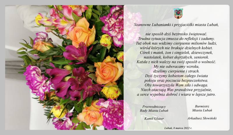 Życzenia z okazji Dnia Kobiet wszystkim lubaniankom i przyjaciółkom Lubania składają Burmistrz Miasta Lubań Arkadiusz Słowiński oraz Przewodniczący Rady Miasta Lubań Kamil Glazer.
