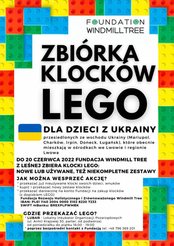 Do 20 czerwca 2022 Fundacja zbiera klocki LEGO: nowe lub używane, też niekompletne zestawy. Zebrane klocki/zestawy klocków trafią do dzieci ze wschodniej części Ukrainy (Donieck, Ługańsk, Mariupol, Irpin, Charków, Cherson i inne), które obecnie mieszkają z rodzicami we Lwowie oraz obwodzie lwowskim w tzw. Szelterach (obiektach, które w przeszłości funkcjonowały jako szkoły, przedszkola, biura i zostały przekształcone w pomieszczenia mieszkalne).
