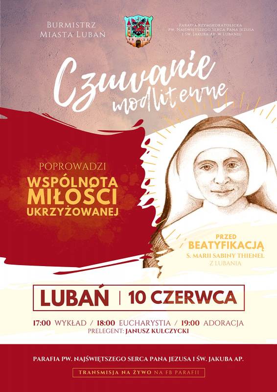 Tuż przed beatyfikacją s. Marii Sabiny Thienel Burmistrz Miasta Lubań, Arkadiusz Słowiński oraz Parafia pw. Najświętszego Serca Pana Jezusa i św. Jakuba Apostoła w Lubaniu zapraszają na Czuwanie Modlitewne, które odbędzie się 10 czerwca 2022 r. (piątek) w kościele na Osiedlu Piastów. Czuwanie poprowadzi Wspólnota Miłości Ukrzyżowanej, która z powodzeniem prowadzi rekolekcje, sesje czy dni skupienia (wydaje też płyty z pieśniami religijnymi).