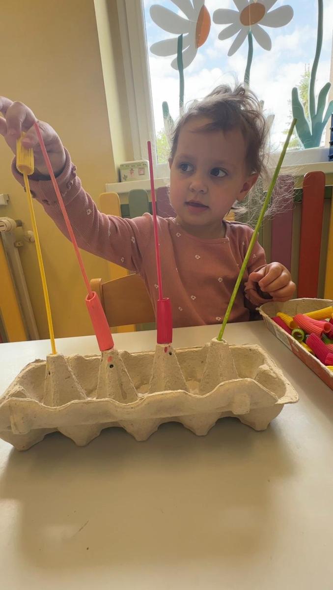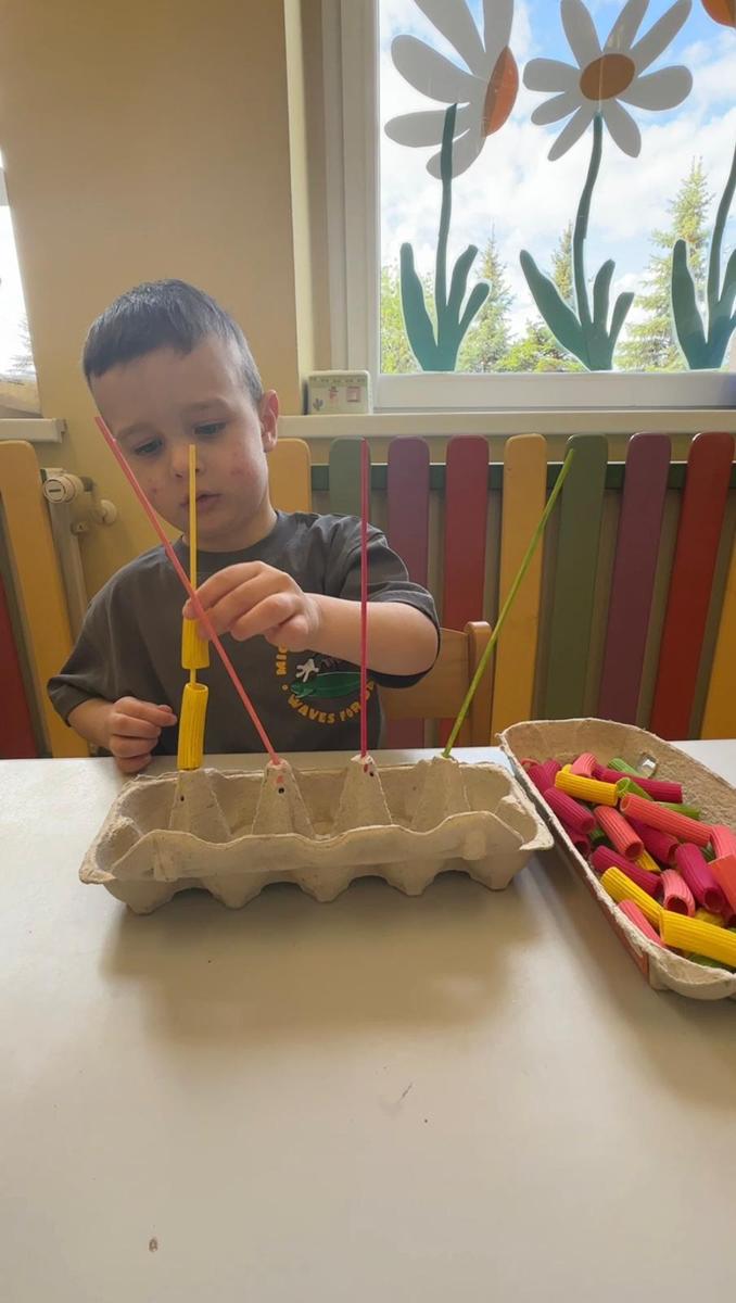 Nauka kolorów jest związana z rozwojem spostrzegania wzrokowego. Zabawa polega na nawlekania kolorowego makaronu na odpowiedni patyczek, a ma na celu ćwiczenie motoryki małej, rozwijanie logicznego myślenia, a przede wszystkim utrwalenie kolorów.