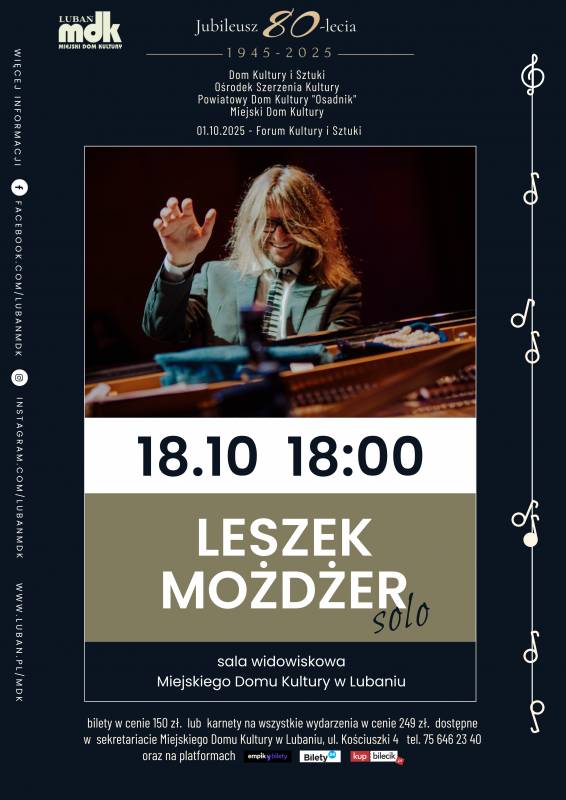 Koncert "Solo" to połączenie wirtuozerii, improwizacji i niezwykłej muzycznej wrażliwości – nigdy nie wiadomo, dokąd zaprowadzi kolejna fraza. To nie tylko występ, ale podróż pełna emocji, humoru i zaskoczeń. To będzie wieczór podczas którego jazz spotka się z klasyką, a każdy utwór nabierze nowego życia! To niepowtarzalna okazja w Lubaniu, aby spotkać artystę, który łamie schematy i maluje dźwiękiem obrazy, o których nie wiedziałeś, że istnieją.
